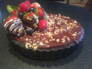 However you don’t need to ‘bake’ to create a celebratory dessert. My go-to dessert is usually in the form of chocolate laden truffle, mousse or ganache. This all stemmed from a dessert I made for my Mum’s Birthday, ‘The Boozy Bumble Brandy Pots’ ….I really must write out the recipe so simple and so effective. This time I have decided to do a Chocoberry Tart. Which is basically the most amount of chocolate and cream you can possibly fill into a double (yes double) chocolate cookie pie crust… With a few berries tumbled in for health 😉 … So here’s my recipe for a sumptuous chocolate and Nutella berry tart in a double chocolate Oreo cream cookie crust.