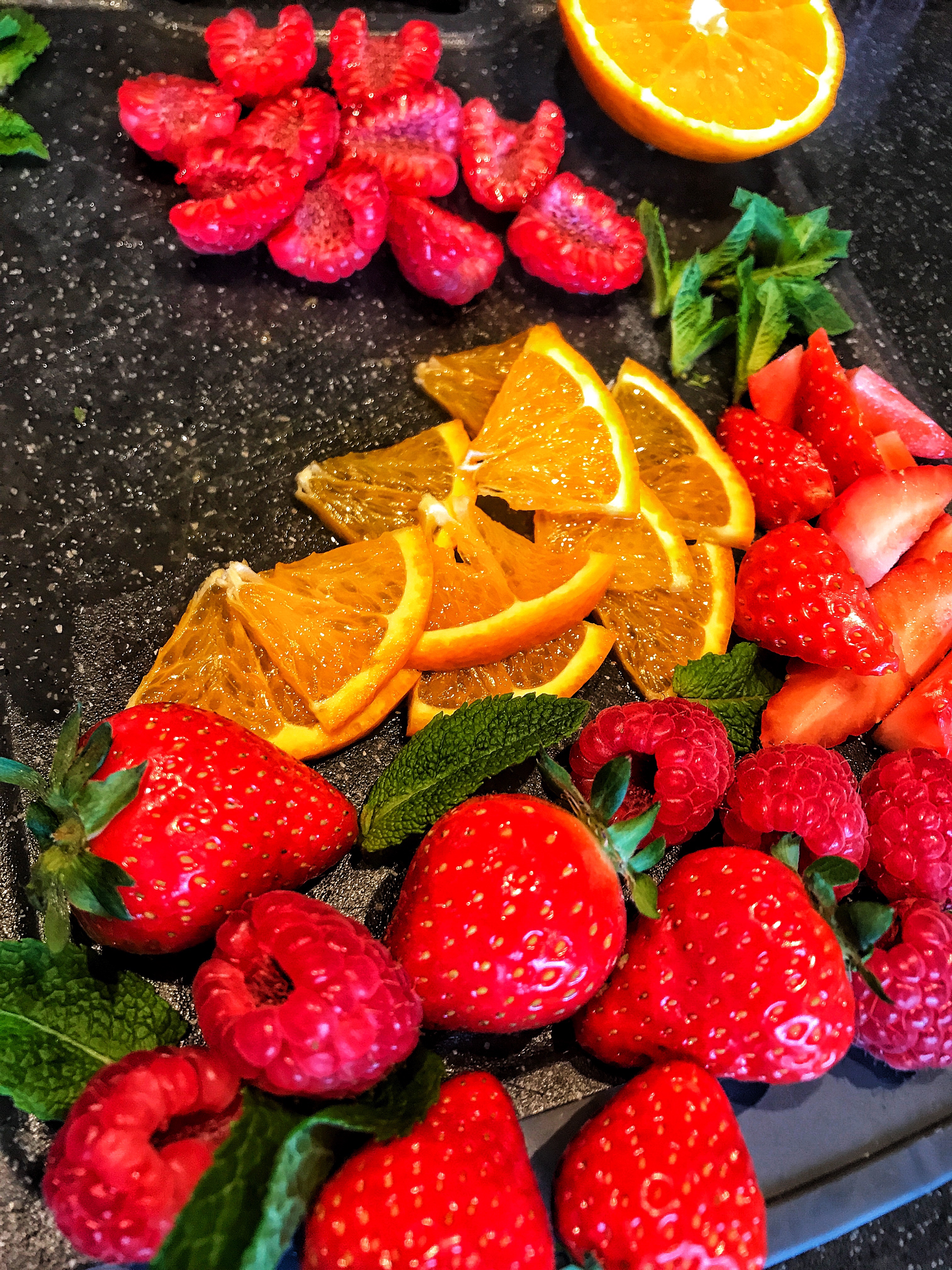 - Step 17 Decorate with slices of orange, raspberry and strawberry and mint leaves