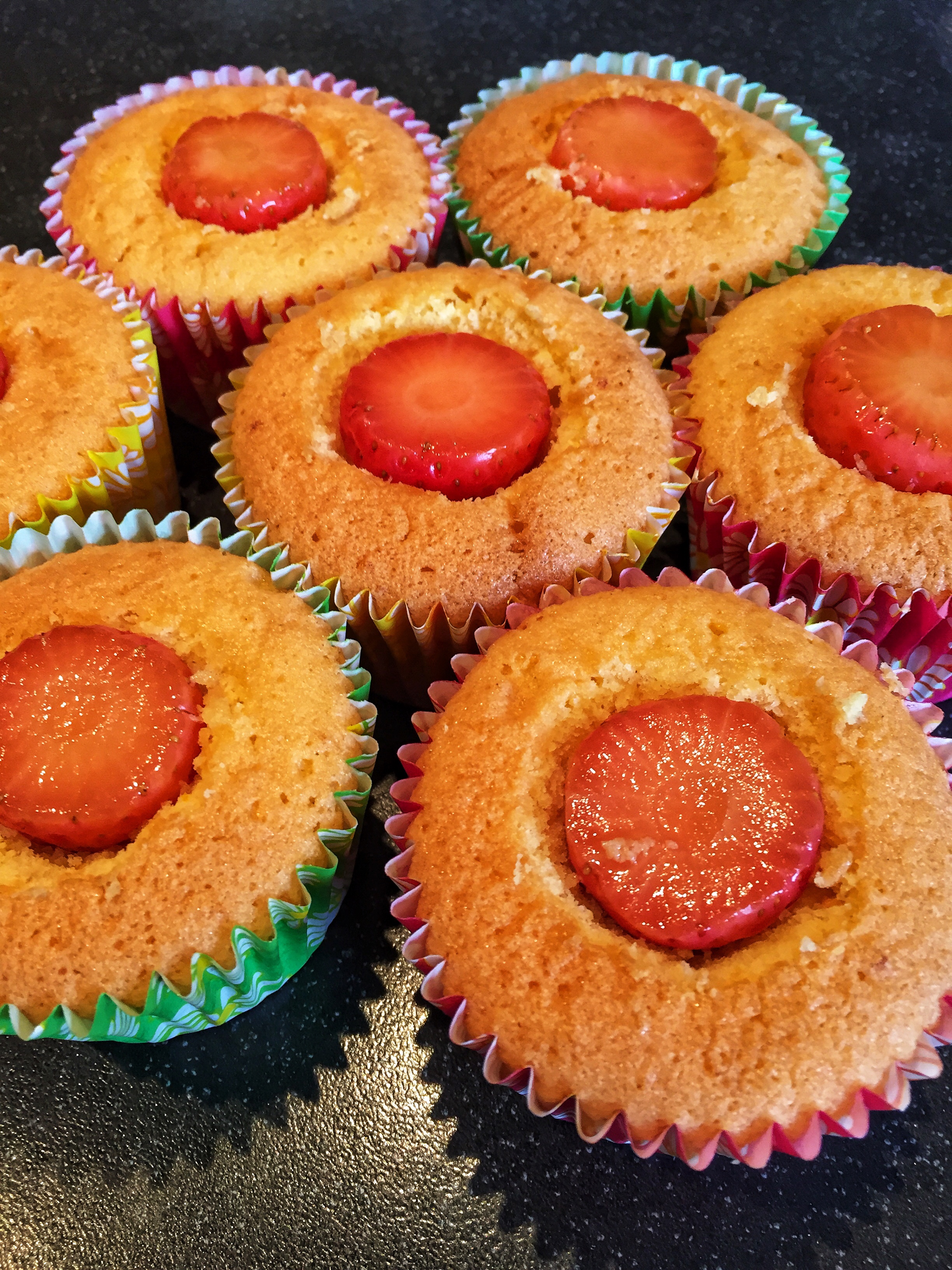 Choose 12 neat, medium sized strawberries that you want inside your cupcakes, place in a container and fill with Pimms and a dash of gin (if you want this booze free, then simply use a berry cordial)… leave for an hour or two and drain the strawberries. My tip… don’t throw away this lovely berry infused liquor, it’s fab when added to Prosecco or simmered down with sugar to make a lovely Pimms syrup!