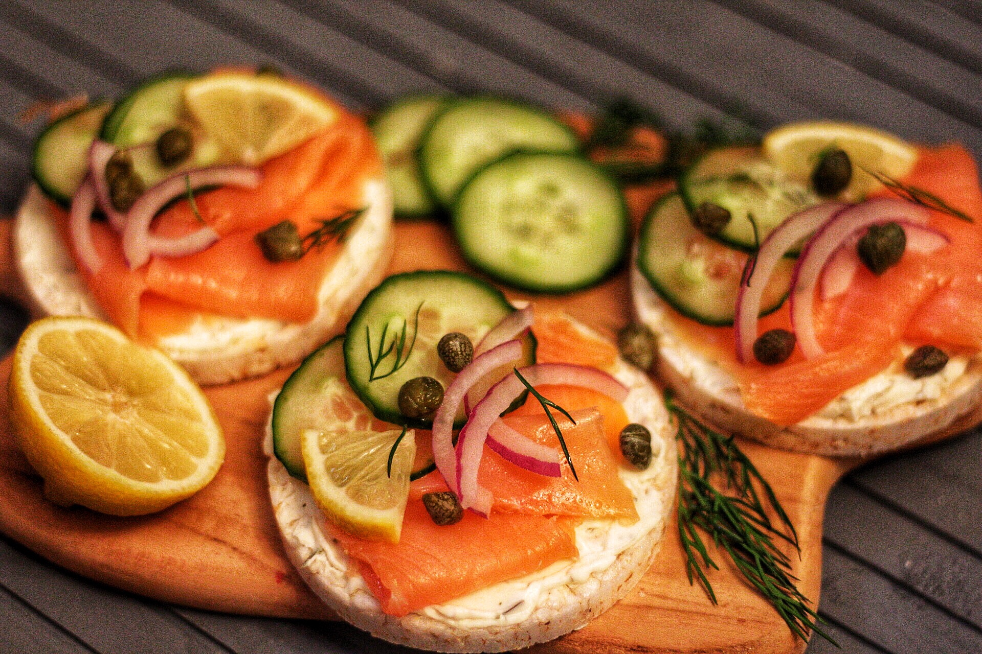 A super quick and healthy lunch or supper dish of rice cakes topped with cream cheese, smoked salmon, capers, dill, lemon and pickled cucumber