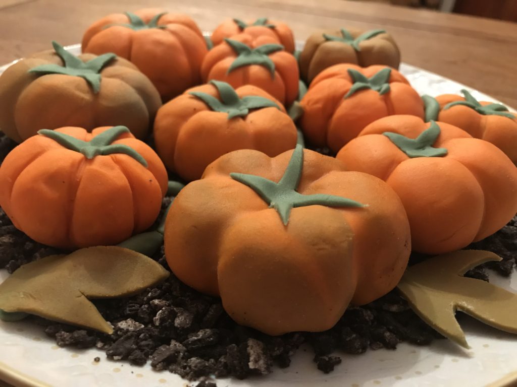 - Pumpkins on their own are super cute and look just great, but what about a pumpkin patch!? If you really want to wow your friends and family then lets go one step further (come on, this is a wow factor treat. Simply crumble some dark Oreo biscuits onto a plate or board and ‘et voila’ there’s your soil… but lets not stop there, add your leaves from the tip above and then simply roll some green paste into strands, weave them through your patch, pop the pumpkins on and around your newly created patch.. and then simply ‘dig in’.